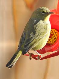(Above, Orange-crowned Warbler feeding at a hummingbird feeder)